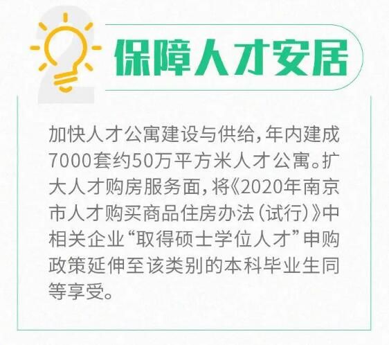 扩大人才购房服务面,将《2020年南京市人才购买商品住房办法(试行)》中相关企业“取得硕士学位人才”申购政策延伸至该类别的本科毕业生同等享受。