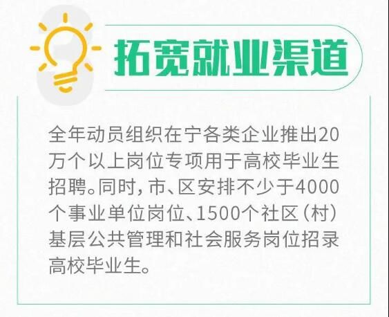 全年动员组织在宁各类企业推出20万个以上岗位专项用于高校毕业生招聘,其中,市、区属国有企业拿出不少于2000个岗位,新型研发机构及其引进或孵化企业提供不少于3000个岗位。同时,市、区安排不少于4000个事业单位岗位、1500个社区(村)基层公共管理和社会服务岗位招录高校毕业生。