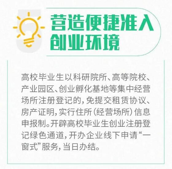 开辟高校毕业生创业注册登记绿色通道,开办企业线下申请“一窗式”服务,当日办结。高校毕业生创办企业有融资需求的,免费提供知识产权质押融资全流程服务。