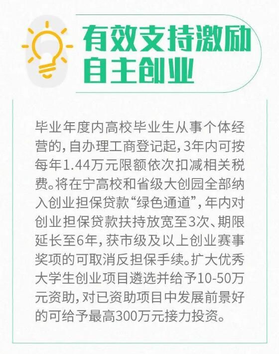 将在宁高校和省级大创园全部纳入创业担保贷款“绿色通道”,年内对创业担保贷款扶持放宽至3次、期限延长至6年,获市级及以上创业赛事奖项的可取消反担保手续。