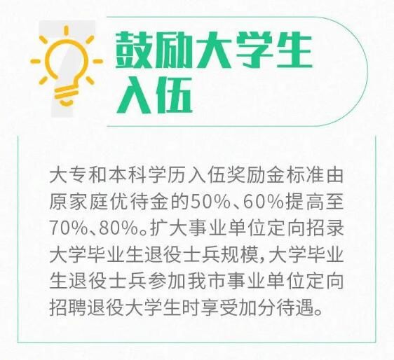 大专和本科学历入伍奖励金标准由原家庭优待金的50%、60%提高至70%、80%。