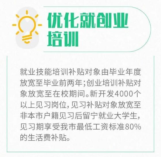 新开发4000个以上见习岗位,见习补贴对象放宽至非本市户籍见习后留宁就业大学生,见习期享受我市最低工资标准80%的生活费补贴。