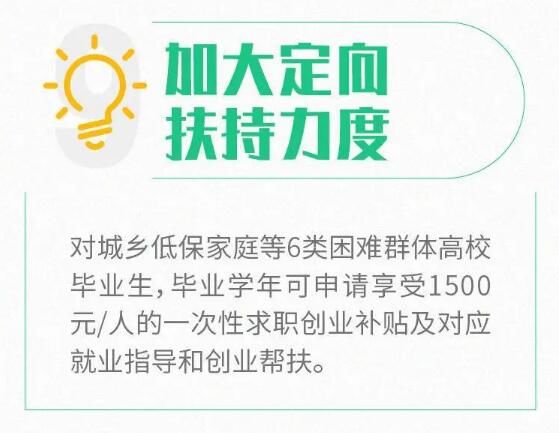 对城乡低保家庭等6类困难群体高校毕业生,毕业学年可申请享受1500元/人的一次性求职创业补贴及对应就业指导和创业帮扶。