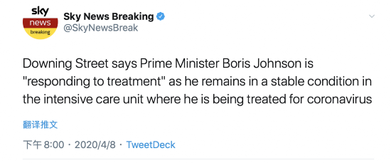 【环球网快讯】据英国天空新闻刚刚消息,唐宁街10号表示,首相鲍里斯·约翰逊还在重症监护室,但治疗已见起色。