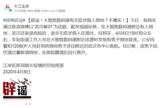 荔枝新闻讯 据武汉市江岸区官方微博@大江金岸 消息,今日(4月8日),有网友通过新浪微博以“武汉解封”为话题、配发视频反映,在大智路数码港附近有人倒地,武汉还是很危险的,很多无症状病人在潜伏。经核实,4月8日15时30分左右,车站街道工作人员在大智路数码港附近巡逻时发现有男子倒地昏迷。公安民警和120救护人员赶到将倒地男子送往附近的武汉市中心医院。经诊断,该男子因饮酒过量醉酒倒地,在医院醒酒后自行离开。