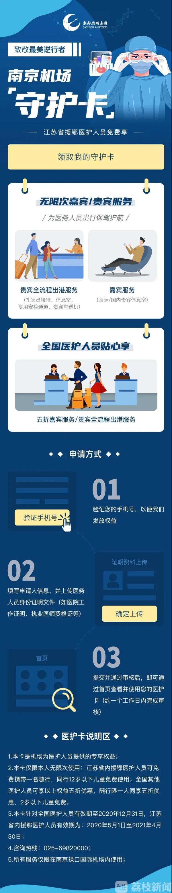 医务人员只需扫码关注“南京禄口国际机场贵宾服务公司”公众号发送“医护卡”关键词,点击活动链接参与,注册并上传相关医疗证件审核通过后即可免费获得“医务人员守护卡”。江苏省援鄂医护人员可享受有效期内无限次的南京机场国内贵宾B区全程出港国内贵宾商务休息室V6及国际头等舱休息室V7的流程服务。全国医护人员可享受以上贵宾服务的半价优惠。