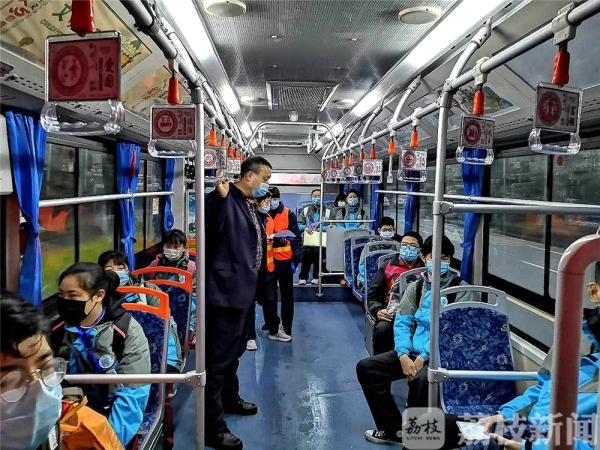 区教育局副局长杨军介绍,疫情期间,为保障学生上下学期间的乘车安全,学生上车前由护导员测量体温正常后方可上车。学生上下车时通过刷“信息卡”,及时将其行踪反馈到家长手机上。