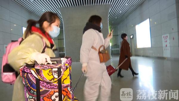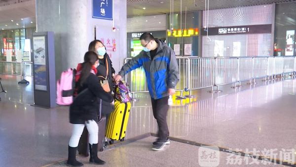 上午十点三十五分,从武汉始发的G1719次列车刚刚到站,身穿一身防护服的季女士带着女儿胡安杰,赶紧拖着行李出站找人。