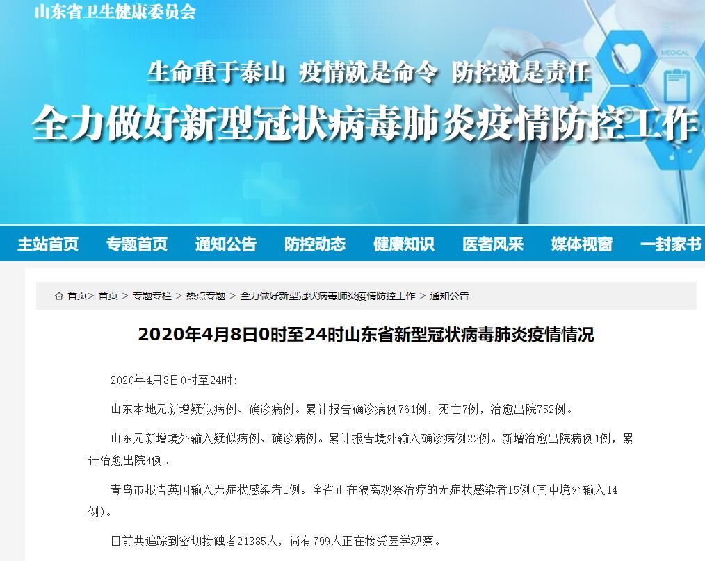 荔枝新闻讯 据山东卫健委官网消息,2020年4月8日0时至24时:山东本地无新增疑似病例、确诊病例。累计报告确诊病例761例,死亡7例,治愈出院752例。