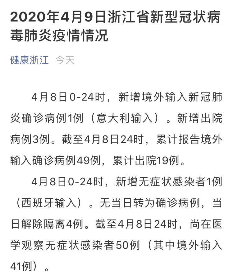 荔枝新闻讯 据健康浙江微信公众号消息,4月8日0-24时,新增境外输入新冠肺炎确诊病例1例(意大利输入)。新增出院病例3例。截至4月8日24时,累计报告境外输入确诊病例49例,累计出院19例。
