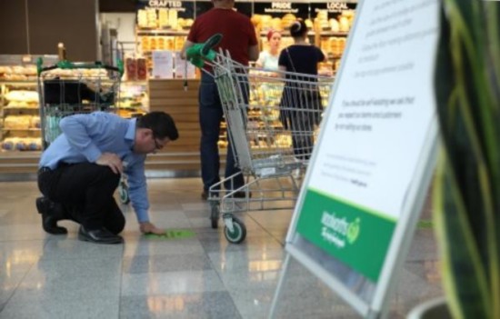在澳大利亚堪培拉的一家商场,工作人员在地上贴上标示,提醒顾客保持购物的安全距离。新华社 图