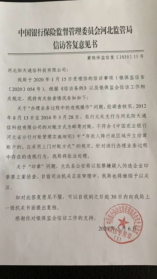 记者于河北阳天通信科技有限公司(下简称“阳天通信”)实际控制人王向阳(化名)处独家获悉,针对新京报此前报道的“消失的4500万银行存款”一事,其于三月中旬收到中国银行保险监督管理委员会河北监管局信访答复意见书(下称“意见书”)。该意见书显示:“农行元氏支行在办理业务过程中存在违规行为。对于该行办理业务过程中存在的违规行为,我局将依法处理。”