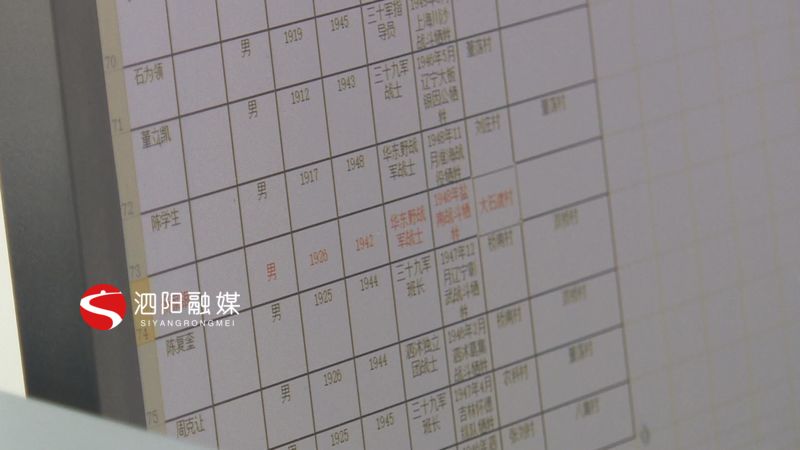 泗阳县退役军人事务局优抚科科长 程海波:这个就是当时我们泗阳在解放战争时期,烈士碑廊送审名单,就是所有烈士的名单都在这个里面,这个上面就有杨家银烈士的,出生年月是1926年,参加革命时间是1942年,生前单位和职务是华东野战军战士。这个上面村别写得是大石渡村,就是八集乡的大石渡村。