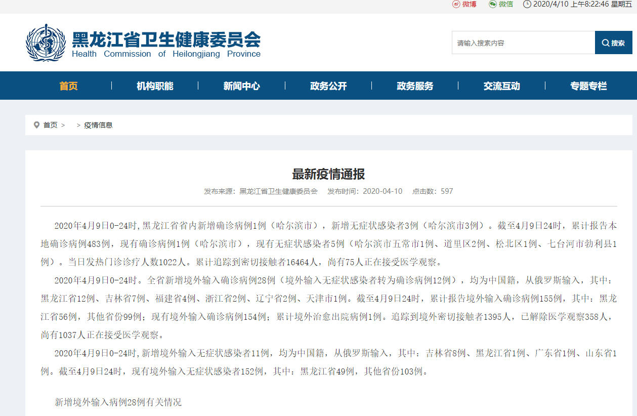 黑龙江省卫健委官网截图。