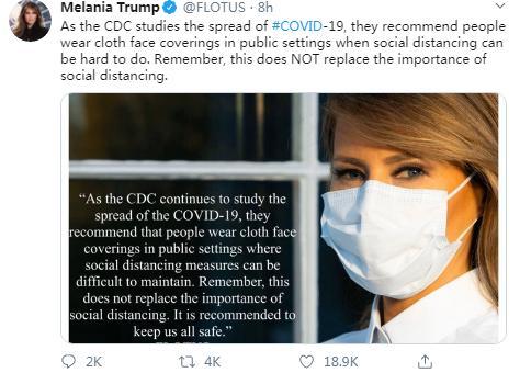 梅拉尼娅写道,“随着对新冠病毒研究的不断深入,美国疾控中心建议人们在公共场所戴布面罩,因为在这些地方很难维持社交距离,比如杂货店和药店。记住,这不能取代社交疏离的重要性。这是另一个能确保我们所有人安全的指导方针。”