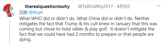 “无论世卫组织做了什么,没做什么。无论中国做了什么,没做什么。这无法抹去特朗普和他的‘信徒’在1月份就知道会有这样的事情发生,但他们依旧选择举行集会、打高尔夫球的事实;这无法抹去我们原本有2个月时间来准备,人们正在死去的事实。”