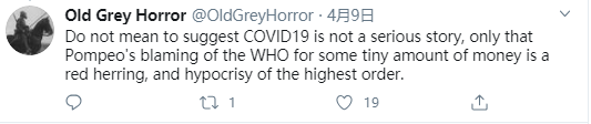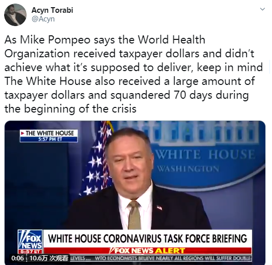 然而,蓬佩奥上面那番指责世卫组织的话,却被美国网友怼了回去。有网友在推特发文写道:“当蓬佩奥说世卫组织收了纳税人的钱却没有完成所应完成的任务时,记住,白宫也拿了大量纳税人的钱,却在危机开始时浪费了70天时间。”