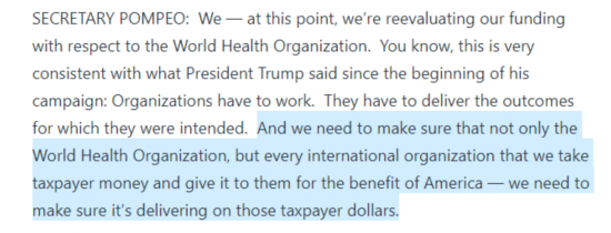 “我们正在重新评估我们对世卫组织的资助。这与总统自竞选开始时所说的话是非常一致的:组织必须发挥作用。”蓬佩奥说,“我们需要确保,不仅是世卫组织,而是所有的我们为了美国利益把纳税人的钱给到他们的国际组织,我们需要确保他们能让这些纳税人的钱发挥作用。”