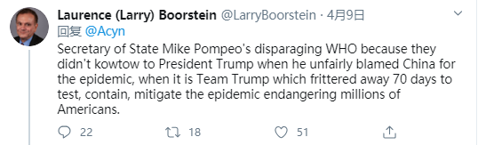 “国务卿蓬佩奥诋毁世卫组织,是因为在特朗普总统拿传染病不公正地指责中国时,他们没有向特朗普磕头,当时特朗普团队浪费了70天进行检测、遏制、缓解危及数百万美国人疫情的时间。”