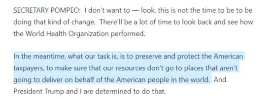 根据白宫网站公开实录,在8日举行的白宫疫情简报会上,被问及有关中美对世卫组织资助问题时,蓬佩奥称,美国正在重新审视对世卫组织的资助。他认为世卫组织拿了美国纳税人的钱,就需要为美国人服务,但“它没有完成应该完成的任务”。