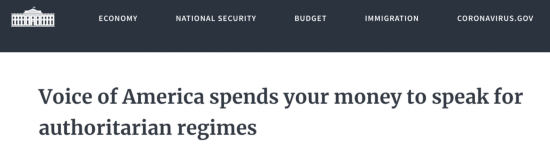 当地时间4月9日,美国白宫在其官网上发布的每日简报中罕见地批评美国之音(VOA),指称其“花费美国纳税人的钱,但却为中国等进行宣传”。原因是VOA赞扬了中国为抗击新冠病毒在武汉采取的“封城”措施,并在社交网站上发布了武汉“解封”当晚的灯光秀等相关报道。