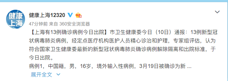 荔枝新闻讯 上海市卫生健康委4月10日通报:13例新型冠状病毒肺炎病例,经定点医疗机构医护人员精心诊治和护理,专家组评估,认为符合国家卫生健康委最新的新型冠状病毒肺炎确诊病例解除隔离和出院标准,于今日出院。