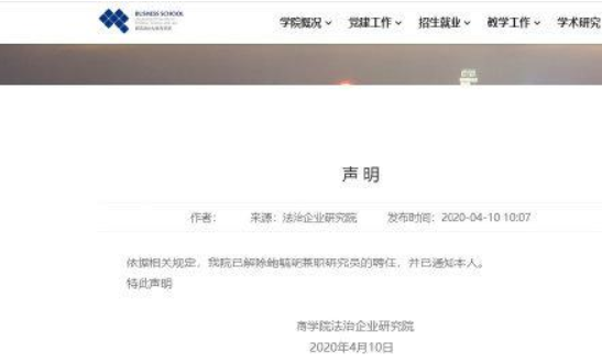 荔枝新闻讯 西南政法大学商学院网站4月10日发布声明,商学院法治企业研究院已解除鲍毓明兼职研究员的聘任,并已通知本人。