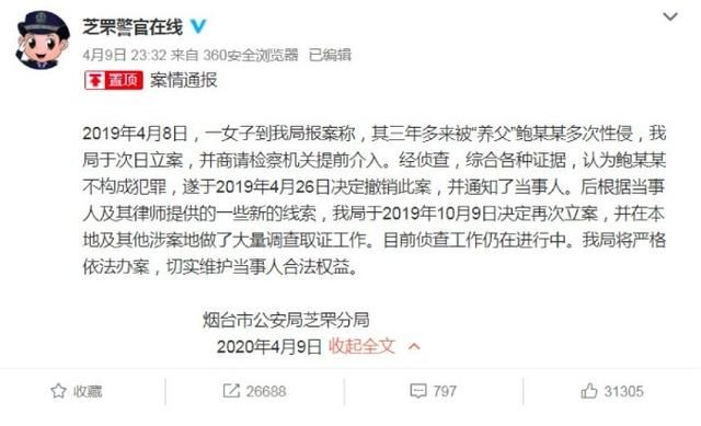 2019年4月8日,一女子到我局报案称,其三年多来被“养父”鲍某某多次性侵,我局于次日立案,并商请检察机关提前介入。经侦查,综合各种证据,认为鲍某某不构成犯罪,遂于2019年4月26日决定撤销此案,并通知了当事人。后根据当事人及其律师提供的一些新的线索,我局于2019年10月9日决定再次立案,并在本地及其他涉案地做了大量调查取证工作。目前侦查工作仍在进行中。我局将严格依法办案,切实维护当事人合法权益。