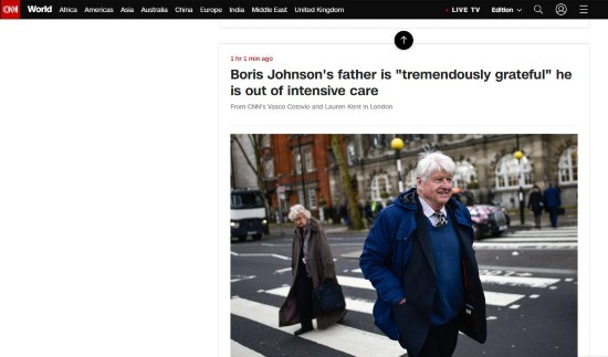 据美国有线电视新闻网(CNN)10日最新消息,英国首相鲍里斯·约翰逊的父亲斯坦利·约翰逊接受采访时称,他的儿子已经离开重症监护病房,并被转移到另一家医院。对此,他表示“非常感激”。