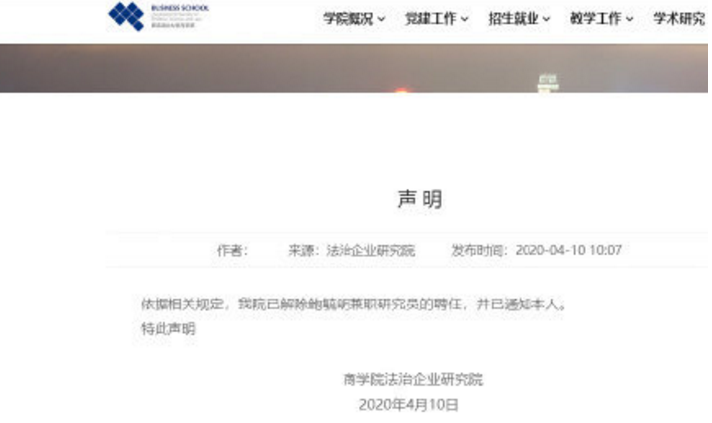 据了解,事件发酵后,鲍某任职多家公司对此进行表态。今天(4月10日)下午,西南政法大学发布声明称,商学院法治企业研究院已解除鲍某兼职研究员的聘任,并已通知本人。