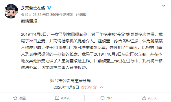 4月9日晚间,烟台市公安局芝罘分局发布通报称,自2019年4月26日撤案后,2019年10月9日已再次立案,并在本地及其他涉案地做了大量调查取证工作。目前侦查工作仍在进行中。