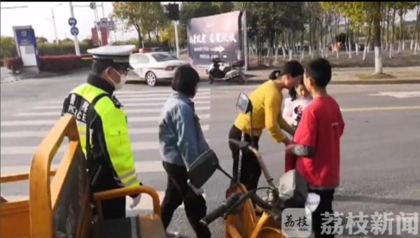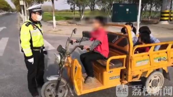 泰州市交警支队海陵大队民警杨浩志介绍,小男孩13岁,未经家长同意偷偷将电动三轮车骑出来,后面带着3个比他更小的小女孩,准备到附近超市买冰棍。