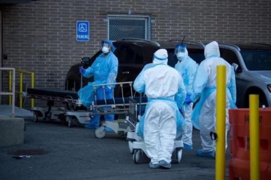 △4月6日,在美国纽约一家医院外,医护人员将死亡患者遗体送往临时冷藏车后推着空床返回。