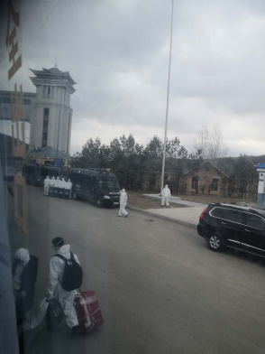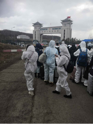 步行走进国门后,迎接曹杰的是身穿防护服的海关人员、医生和警察。在他们的引导下,曹杰和其他三十多人在入关之前,就接受了核酸检测,并填写了健康状况表格,然后才依次通关。随后,他们被大巴车送到绥芬河的一座体育馆中等待核酸检测的结果,体温异常的人则被单独送走了。