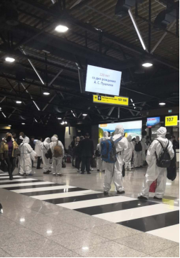 曹杰购买的是当地时间6日由莫斯科谢列梅捷沃机场直飞海参崴的SU1702次航班,预计飞行时间8个多小时,跨越7个时区。一抵达机场,曹杰就看到不少同样准备回国的中国人,因为他们实在太好辨认了:口罩、手套、护目镜、白色的一次性防护服,这是俄罗斯人绝对不会做的准备。