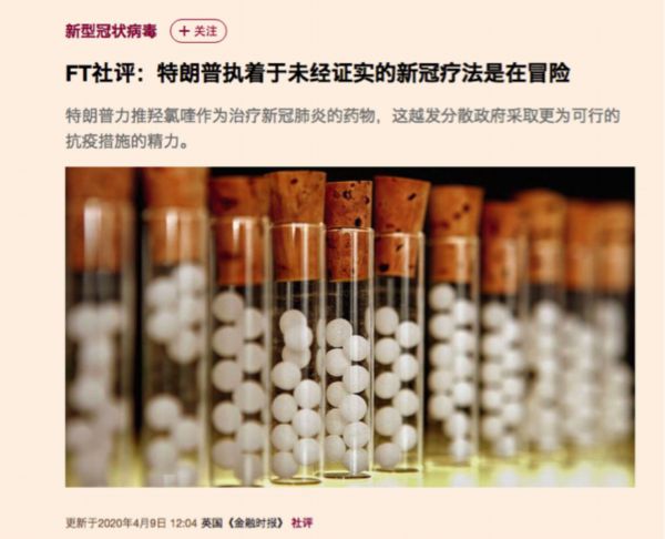 英国《金融时报》对此发表评论称,特朗普执着于未经证实的新冠疗法是在冒险。文章指出,特朗普的做法只会导致美国政府忽略对更可行的抗疫方法的关注。而那些真正需要羟基氯喹治疗疟疾、狼疮和类风湿性关节炎的人也会因此缺乏该类药物。