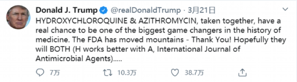 3月21日,特朗普在社交媒体发文称,羟基氯喹和阿奇霉素的组合可能会改变“医学史上的游戏规则”。