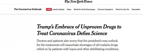 据《纽约时报》报道,特朗普在一种抗疟疾药物的制造商身上能获得少量的经济收益。