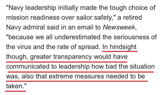 一名退役的美国海军将军在发给《新闻周刊》的一封电子邮件中说:“海军领导层最初面临着一个艰难的选择,要在战备执勤和舰员安全健康之间做出选择,因为我们都低估了病毒的严重性和传播速度。在事后看来,更大的透明度会让领导层了解情况的严重性,从而需要采取一些极端措施。”