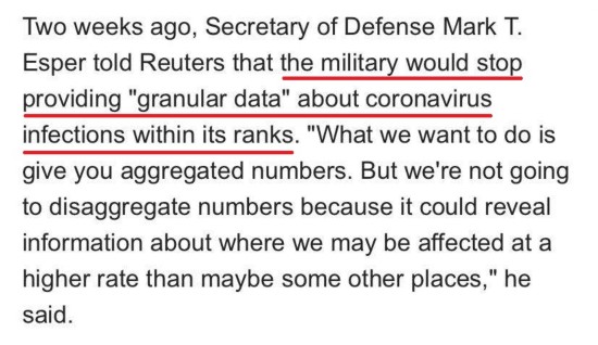 美国国防部长马克·埃斯珀此前表示,将停止公布有关美军确诊病例的详细数据,以防透露出哪些部队更容易被感染。军方将尽最大努力“在这场危机中平衡信息公开的透明度和行动保密程度”。报道称,美国军方的消息人士和观察人士表示,与所谓的“平衡”相反的是,美军部队暂停向了公众公开感染数据。