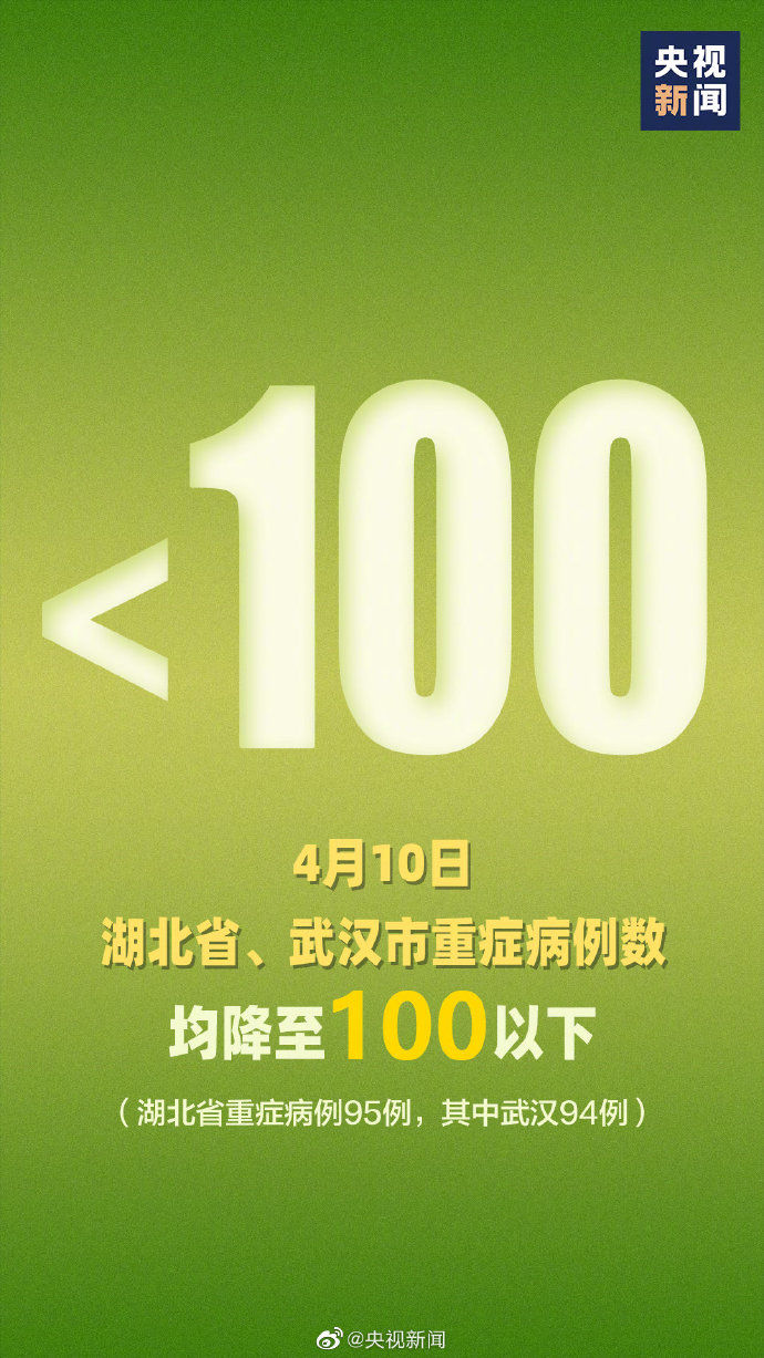 截至4月10日24时,湖北无新增确诊病例,新增治愈出院病例28例(武汉27例),新增死亡病例3例(武汉2例),现有确诊病例320例(武汉319例),其中重症病例95例(武汉94例)。转起加油!战疫情!