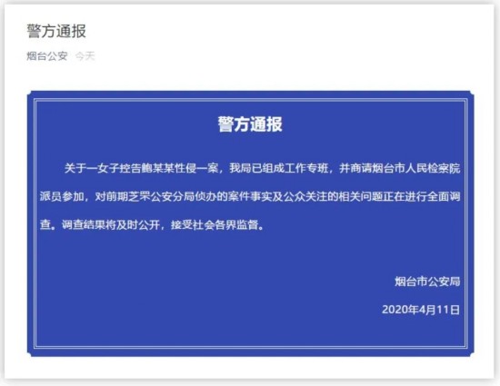 4月11日凌晨,烟台市公安局发布警方通报:关于一女子控告鲍某明性侵一案,我局已组成工作专班,并商请烟台市人民检察院派员参加,对前期芝罘公安分局侦办的案件事实及公众关注的相关问题正在进行全面调查。调查结果将及时公开,接受社会各界监督。