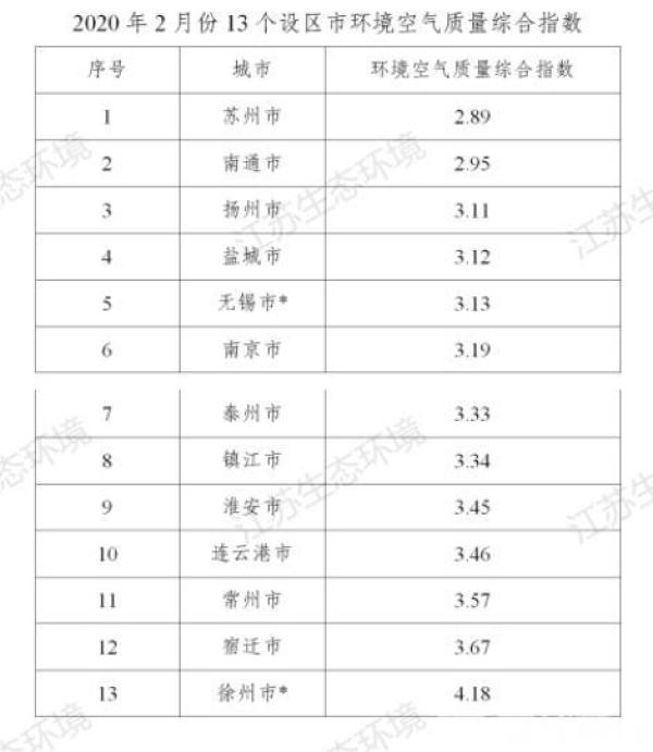 按照国家环境空气质量综合指数法排名,在全国168个城市中,我省13个设区市位于第28到108名之间。其中,苏州、南通、扬州指数排名靠前。