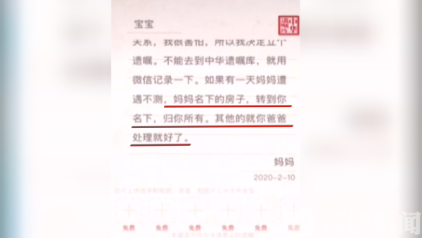 中华遗嘱库工作人员告诉我们,目前收到的"微信遗嘱"中,有不少人会提及过世后资产的处理。但需要提醒的是,"微信遗嘱"不具备法律效力。微信遗嘱是一个情感上的遗嘱,是对家人家风的传承,对家人爱意的表达,如果说您想要处理您名下的资产,还是建议您到中华遗嘱库中心现场,去订立一个真实、合法、有效的遗嘱。