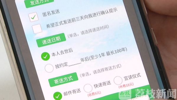 中华遗嘱库江苏第一登记中心法务专员郭琳说:“微信遗嘱里有一个程序,是选择您什么时候寄出微信遗嘱。选项有本人去世之后,也可以自己选择某一年某一月,确定好日期。微信遗嘱是对所有市民开放的,每个人在这个微信留言的平台上查看,是否有人给自己留有幸福留言。”