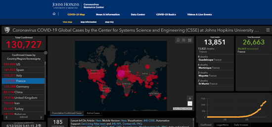 据美国约翰斯·霍普金斯大学发布的实时统计数据显示,截至北京时间4月12日6时30分左右,法国新冠肺炎累计确诊病例130727例,累计死亡病例13851例;与前一天6时30分数据相比,法国新增确诊病例4797例,新增死亡636例。