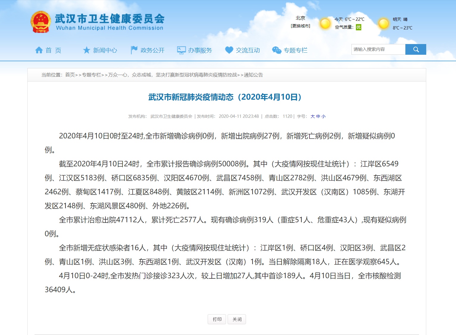 全市累计治愈出院47112人,累计死亡2577人。现有确诊病例319人(重症51人、危重症43人),现有疑似病例0例。