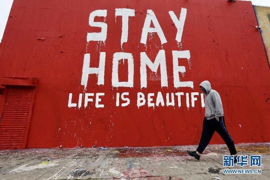 4月9日,一名男子经过美国洛杉矶市区内的防疫主题的壁画。 为减缓新冠病毒的传播,洛杉矶市长7日下令,民众在公共营业场所要戴口罩或用织物遮挡住脸,这一行政令于2020年4月10日生效。 新华社发