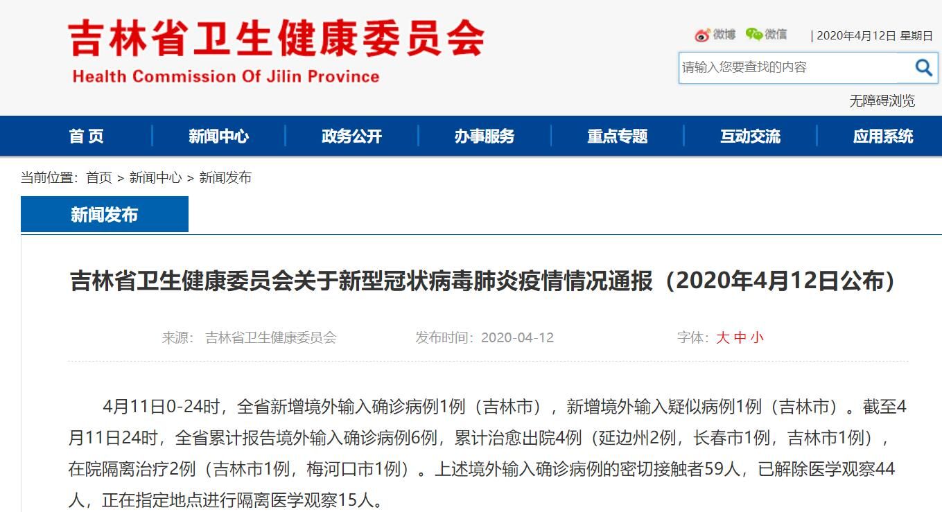 荔枝新闻讯 吉林省卫生健康委员会消息,4月11日0-24时,全省新增境外输入确诊病例1例(吉林市),新增境外输入疑似病例1例(吉林市)。截至4月11日24时,全省累计报告境外输入确诊病例6例,累计治愈出院4例(延边州2例,长春市1例,吉林市1例),在院隔离治疗2例(吉林市1例,梅河口市1例)。上述境外输入确诊病例的密切接触者59人,已解除医学观察44人,正在指定地点进行隔离医学观察15人。