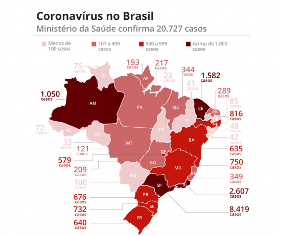 截至当地时间4月11日14时,巴西全国共确诊新冠肺炎病例20727例,比昨日新增1089例,在过去24小时内新增死亡病例68例,全国累计死亡病例1124例,死亡率为5.4%。受新冠病毒疫情蔓延的影响,地处热带雨林的亚马孙州的新冠肺炎确诊病例急剧上升,截至当地时间11日,该州已有新冠确诊病例1050例,死亡病例53例,其疫情严重程度仅次于圣保罗州、里约热内卢州和塞阿腊州。